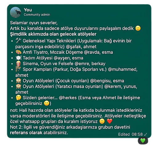 Artık bu whatsapp kanalında sadece atölye duyurularını paylaşalım dedik 🙂